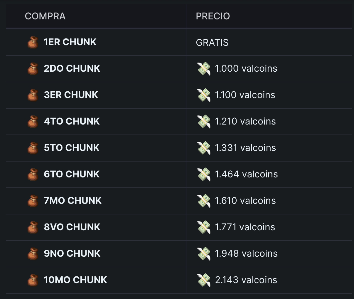 Puedes hacerlo, solo recuerda que para claimear más terreno y agrandar tu base necesitas valcoins. Te dejaremos la tabla de precios y los limites de chunks que puedes expandir.